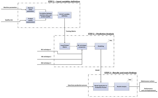 The goal of our research framework (Figure 2) is to incorporate product quality into the management of maintenance activities and to implement a suitable PdM according to a variable threshold that describes the quality level the manufacturing process must guarantee. The framework can be divided into three main steps, which provides the input variables’ definition, the predictive analysis model’s definition, and finally, validation and utilization.