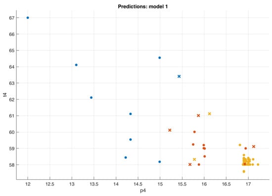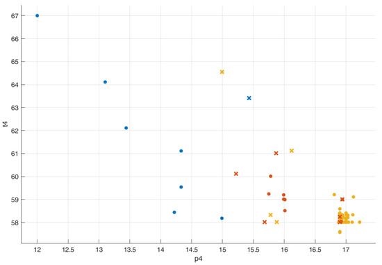 In the scatter plot (p4 vs. t4) in Figure 8, the yellow, orange, and blue dots represent, respectively, FPY = 1, FPY = 2, and FPY = 3. In addition, the yellow and orange dots overlap in some areas of the plot (X represents incorrect predictions).