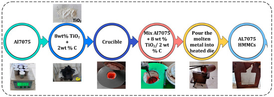The preparation process for machined workpieces used in the experiments are shown in Figure 1. The Ø 20 mm and 100 mm long AA7075T6 rods are cut into pieces and placed in the crucible followed by heating at a rate of 750 °C. The weight fractions of TiO2 and C are 8% and 2%, respectively, and they are preheated to around 450 °C for the removal of moisture and also to improve wettability. A uniform stirring process is then performed for around 10 min at 500 rpm. A cast composite with 150 mm × 150 mm × 12 mm dimensions was then cut using wire EDM. The chemical composition for the cast aluminium 7075T6 is illustrated in Table 1.