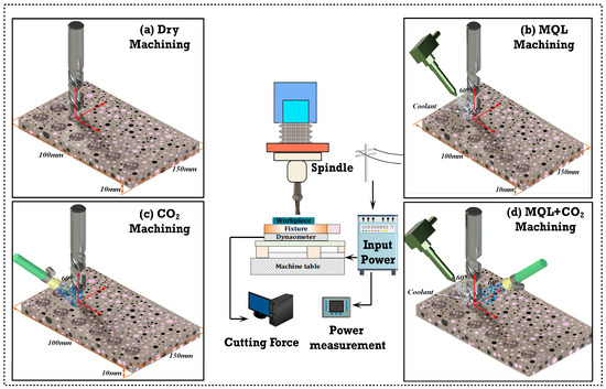 Illustration of drilling environments (a) dry, (b) MQL, (c) CO2, (d) CO2+MQL.