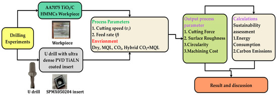 Global climate change poses a significant threat to people across the globe. Despite its considerable contribution to global warming [1], India is expected to reduce its carbon emissions. Various measures have been implemented to reduce emissions during the operational phase of manufacturing [2]. The manufacturing industry is one of the most critical sectors that requires a requirement in energy consumption. Many countries, including China (0.723 CNY/kWh) and India (8.5 CNY/kWh), are concerned about the increasing electricity prices [3]. Drilling holes is one of the most crucial operations in the manufacturing components. It is critical to ensure that a drilled hole has precise diameter and depth in industries such as aerospace, automotive, and precision instruments. Especially drilling hard material can be costly for certain hard-to-cut materials, such as Inconel, titanium alloy, aluminium metal matrix composite, etc. [4]. In today’s advanced age of cutting-edge technologies, there is a growing fascination with metal matrix composites (MMCs) that incorporate particulate reinforcements. These innovative materials, known as hybrid MMCs, have garnered significant attention and show great promise. Al7075-T6 is commonly used as an aluminium matrix material. As a result of its exceptional machinability, formability, and castability, it is a popular choice for a wide range of applications [5]. The Al7075 base material was fabricated into MMCs utilising various oxides and ceramic reinforcements, including TiO2, C, B4C, Al2O3, TiB2, and SiC. It was found that fabricated MMCs exhibited improved hardness, impact resistance, and tensile strength [6]. A stir-cast Al7075/C/TiO2 MMC has been reported by Danappa et al. [7]. The study examined how varying weight percentages (wt%) of TiO2 particles affect the wear rate. It was found that incorporating 3–5 wt% TiO2 particles into the MMC significantly reduced the wear rate. Arunkumar et al. [8] performed work using stir-cast Al7075/TiC/Al2O3/C MMCs. Additionally, the study indicated that differences in the wt% of TiC content of manufactured MMCs were associated with significant differences in the wear rate. Nowadays, the conventional manufacturing sector is stepping into a sustainable manufacturing process due to several factors such as laws enforced by the government, environmental management systems, effective use of resources, increased productivity, labour management, waste recycling, low-cost products, and high customer satisfaction.