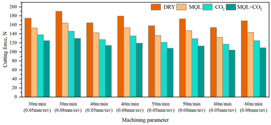 To ensure high-quality machined surfaces, it is important to prevent chips from melting and adhering to the cutting edge to produce BUE, which can cause additional friction and increase the cutting force [27]. The cutting force (Fc) reflects the difficulty of machining and directly affects the tool life [28]. Drilling experiments under different cooling conditions (dry cutting, MQL, CO2 cooling, and CO2+MQL cooling) and cutting parameters (feed rates and cutting speeds) were used to determine the most effective cooling method to reduce cutting force. The results, depicted in Figure 4, show that the drilling force decreases as the vc increases in dry conditions. When the vc is set at 30 m/min and the f is set at 0.08 mm/rev, the Fc is at its highest, measuring 190 N under dry conditions. Using MQL or CO2 cooling alone can reduce the Fc by 14% and 24% under the same machining parameters. This shows that the use of lubrication and cooling can improve machinability. When MQL is combined with CO2 mixing-assisted cooling, the Fc during the drilling process can be reduced by 32% compared to dry conditions at a measurement of 130 N. This is because MQL and CO2 provide both lubrication and cooling, which greatly reduces the negative impact of cutting heat on machining and improves the machinability of drilling.