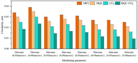 - The analysis of circularity errors shows substantial improvements under the auxiliary cooling conditions compared to dry cutting. The minimum circularity error observed with MQL+CO2 cooling represents a 60% improvement, underscoring the benefits of auxiliary cooling in achieving higher precision and quality in machined parts.