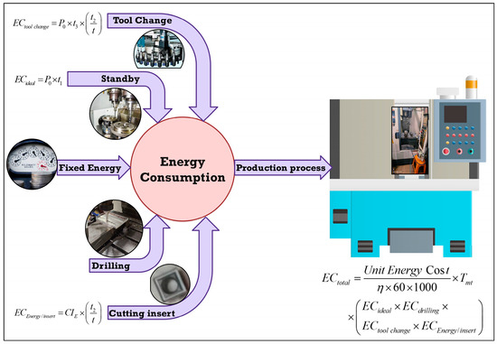 The energy consumption of the whole drilling process is shown in Figure 7. For drilling processing, the method proposed by [34] was used to calculate the energy consumption of each process. The total energy consumption is composed of the ideal part; drilling part; tool change part and energy/insert (cutting insert—CI) part; and CEFEnergy carbon emissions factor for energy (0.7210 kg CO2/kWh); the specific calculation process is as follows: