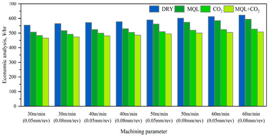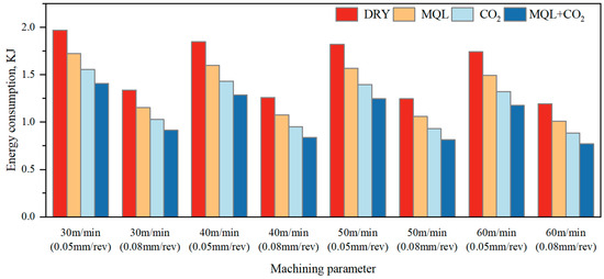 In mechanical processing, there is a greater emphasis on quality and stability. However, with the advancement of green manufacturing technology, manufacturing companies are now paying attention to the sustainability of manufacturing and processing [33]. Energy costs differ between various processing techniques; the difference in energy costs is prominent for actual high-volume manufacturing processes, so it is necessary to optimise energy consumption. During the optimisation process, the impact of processing parameters and auxiliary cooling methods on energy must be revealed through energy consumption analysis of the substantial impact.