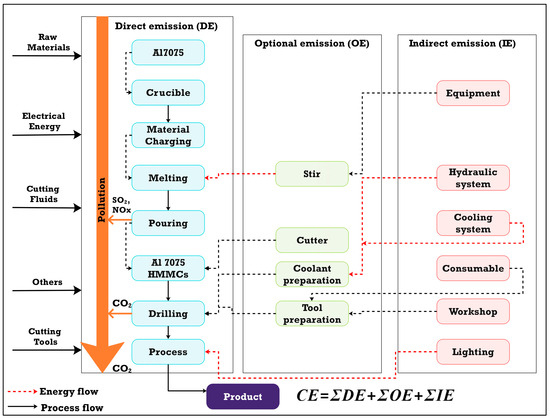 During the drilling, whether it involves dry cutting or cutting with auxiliary cooling, carbon emissions occurred within the working environment leading to the emission of the greenhouse gases that can harm the operators involved [35]. The carbon emissions reflect the negative impact of processing on the environment and the use of resources [36]. Additionally, the CO2 cooling also emits carbon into the working environment, thus further contributing to the overall carbon emissions of the process. The primary source of carbon emissions can cause more energy consumption. To comply with the requirements of green manufacturing, it is essential to analyse and control carbon emissions. The detailed flowchart of carbon emissions that occurred during the drilling process is shown in Figure 9. The carbon emissions of the drilling process can be calculated in the Equations (7) and (8).