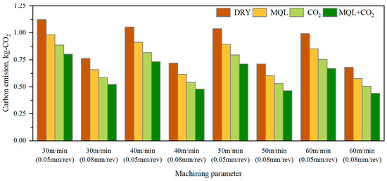 Figure 10 shows the graph representing the carbon emissions that occurred during each experiment. The feed rate has a greater impact on carbon emissions. As the feed rate increases, the carbon emissions decrease. In the case of dry conditions, when the feed rate increases from 0.05 mm/rev to 0.08 mm/rev, the carbon emissions corresponding to different cutting speeds dropped by 68% on average. The carbon emissions produced by the added cooling method are less than those of dry cutting. This means that the cooling method can effectively reduce the carbon footprint generated with respect to energy consumption. The MQL+CO2 method is environmentally friendly with the smallest carbon emissions. This mixed cooling technique reduces the energy consumption in processing and effectively controls the direct emission of CO2. In all experiments, the MQL+CO2 cooling method had the lowest carbon emission of 0.35 kg-CO2 when the cutting speed was 60 m/min and the feed rate was 0.08 mm/rev.