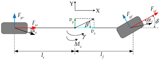 where and represent the speed of the vehicle in the longitudinal and lateral directions, respectively; is the total mass; stands for yaw rate; represents the moment of inertia; indicates the coefficient of air resistance; and represent the distance from the center of mass of the vehicle to the front and rear axles, respectively; is the front wheel angle; is the total longitudinal force of the driving wheel; is the additional yaw moment; represents the lateral force on the front side wheel; and represents the lateral force on the rear side wheel.