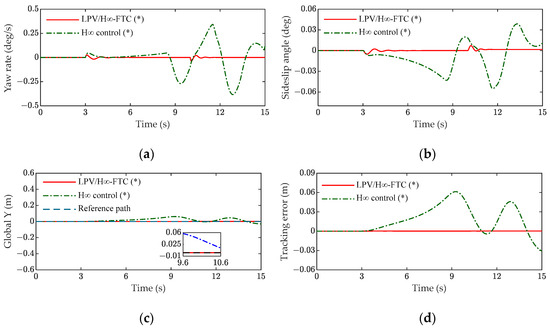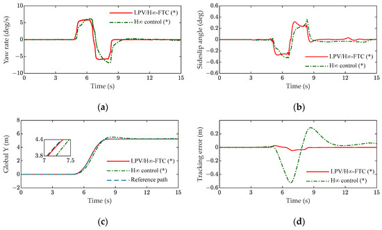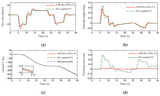 Scene B: In the experiment, the vehicle was subjected to lane changing (and a single shift line condition) at a speed of 72 km/h on a road surface with a coefficient of adhesion of 0.85; the driving path is shown in Figure 4c. The actuator failure was as follows: at 3 s, the left front wheel had a failure fault , and at 5 s, the right rear wheel had a stuck fault . (a) and (b) in Figure 4 are the vehicle state parameters, including the yaw rate and side slip angle. When a fault occurred, the state parameters of the LPV/H∞ controller were relatively stable, while the state parameters of the H∞ controller had obvious changes. As shown in Figure 4c,d, the maximum tracking error of the LPV/H∞ controller was 8.99% of that of the H∞ controller, and the tracking error was limited to 0.05. Therefore, the tracking effect of the LPV/H∞ controller was better.
