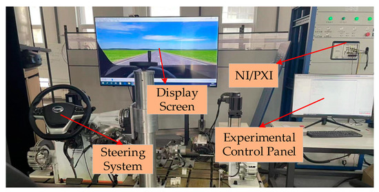 To verify the real-time performance of the fault-tolerant control strategy, HIL experiments were conducted. The passenger car HIL experimental platform mainly consisted of a steering system, NI/PXI, a display screen, and an experimental control panel, as shown in Figure 6.