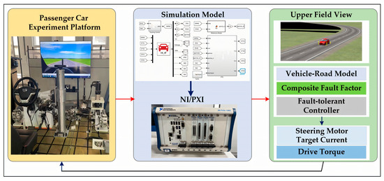 Figure 7 shows the specific architecture diagram for realizing the fault-tolerant control hardware-in-the-loop system. The realization process was as follows: first, the designed controller simulation model was embedded into the LabVIEW program, and the NI/PXI sent the calculated front wheel angle to the underlying steering controller according to the real-time calculation of vehicle state information. Secondly, the calculated driving torques of the four driving wheels were sent to the lower layer controller. After the steering system and drive actuators worked, NI/PXI received real-time feedback from the processing pedestal via CAN bus, and then the CarSim in it generated the new vehicle state information to form the closed-loop control. Finally, the vehicle’s trajectory could be observed in real-time through the display screen, and the data curve generated by the data acquisition module could be observed on the experimental control panel.