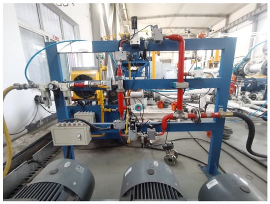 To evaluate the effectiveness of the proposed air chamber pressure control method, we developed a comprehensive simulation approach that replicates environmental disturbances and active control factors in the air chamber pressure regulation process. Subsequently, we designed a closed-loop circuit for SPB control, as illustrated in Figure 4. The air chamber pressure control system, along with the corresponding human–machine interface software, was developed using Simulink and PLCnext Engineer. Additionally, a Ø2.5 m multi-purpose SPB shield machine test bench was constructed, as shown in Figure 5 [].