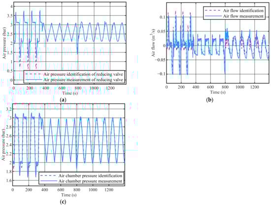 Identification results: (a) identification results of pilot stage pressure of pneumatic proportional pressure-reducing valve; (b) identification results of air flow; (c) identification results of air chamber pressure.