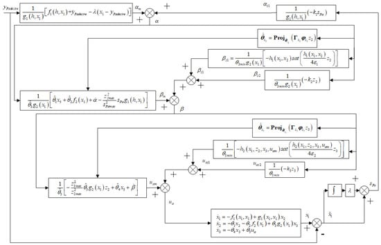 This small section fully considered the slurry level disturbance of the air chamber pressure model and then designed a nonlinear ARC law for air chamber pressure control to improve the robustness of the air chamber pressure to slurry level disturbances. At the same time, online adaptive identification of time-varying uncertain model parameters was adopted to improve steady-state accuracy and a Lyapunov stability proof was conducted. The block diagram of the ARC for air chamber pressure is shown in Figure 7, in which the bold represents vectors or matrices.