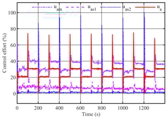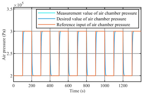 Based on the designed nonlinear ARC law for the air chamber pressure regulation system, a simulation investigation was conducted under slurry level disturbances in excavation strata. The known parameters, gain, and coefficients used for the simulation and experiment are shown in Table 2. Firstly, a model of the air chamber pressure’s nonlinear ARC under slurry level disturbance was built using Simulink. In the simulation, the reference input for the air chamber pressure was a square wave signal, and the simulation curve is shown in Figure 8. It can be observed that the green measurement value of the air chamber pressure can track the blue desired value of the air chamber pressure well in Figure 8. The stable time is 6.44 s when the air chamber pressure rises in the simulation, and the relative steady-state error is less than ±0.25%; the stable time is 5.30 s when the air chamber pressure decreases, and the relative steady-state error is less than ±0.25%. The simulation of air chamber pressure PID control was conducted as a comparison with the nonlinear ARC. The stable time is 11.63 s when the air chamber pressure rises in the simulation, and the relative steady-state error is less than ±0.50%; the stable time is 9.14 s when the air chamber pressure decreases, and the relative steady-state error is less than ±0.50%. The dynamic and static performance comparison of the nonlinear ARC and PID controller for the air chamber pressure is shown in Table 3. It can be observed that the transient and steady performance of nonlinear ARC is better than that of the traditional PID controller, especially in the presence of slurry level disturbances. The curves of the ARC effort for , , , and are shown in Figure 9.