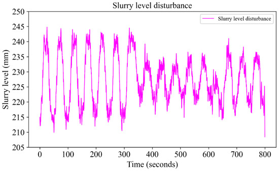 Based on the developed SPB shield tunneling machine test bench, an experiment on the performance of the air chamber pressure nonlinear ARC under level disturbances caused by slurry input and output flow disturbances was carried out. In the experiment, the reference input of the air chamber pressure included continuous step signals, triangular wave signals, and sine signals. The slurry level disturbance is shown in Figure 10. The experimental curve is shown in Figure 11. It can be observed that the magenta measured values of air chamber pressure can track the blue reference input of the air chamber pressure well under slurry level disturbances.