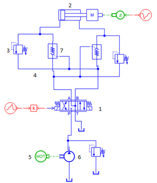 Hydraulic system for height adjustment of the shearer: 1—electro-hydraulic servo valve, 2—hydraulic cylinder, 3—relief valve, 4—hydraulic pipelines, 5—motor, 6—pump station, 7—pilot valve.