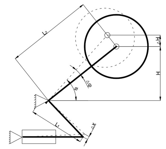 In the above equation, L1 represents the length of the height adjustment mechanism’s small rocker arm. The expression for can be derived as follows: