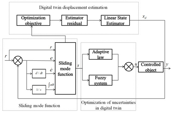 By analyzing the physical entity of the shearer height adjustment mechanism, a digital twin model of the height adjustment component is obtained. Within the virtual entity, a displacement estimator for the shearer height adjustment is designed to achieve the desired output of the height displacement. By employing adaptive laws and fuzzy systems to optimize uncertainties, an adaptive sliding mode controller is designed to achieve autonomous control of the shearer height adjustment [20,21]. The structure of the adaptive fuzzy sliding mode control system for the shearer height control is shown in Figure 6. Once the shearer cut through rock seams, dynamics of the shearer changes over time and the control performance may become worse. Thus, the controller parameters shall be updated in virtual space by adaptive law.
