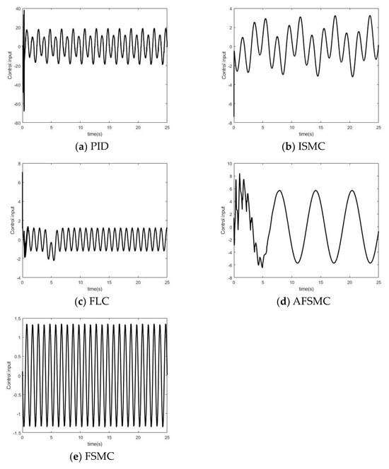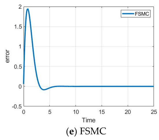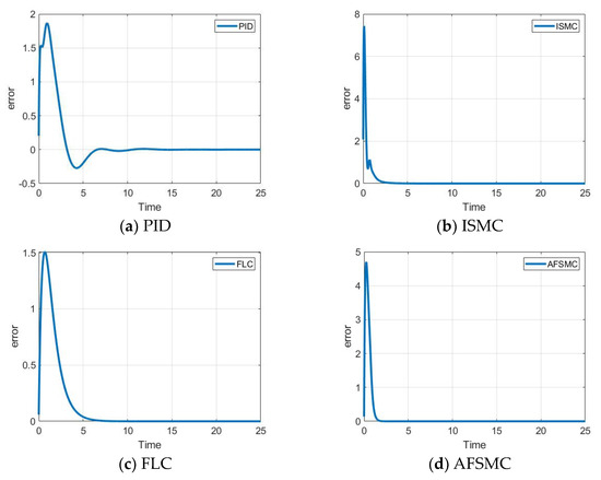 The performance of the controllers is compared in Table 3. We use three indexes: steady-state error, settling time, and maximum absolute control input. The AFSMC method exhibited the fastest settling time. Figure 9 and Figure 10 illustrate the tracking error and control input for all compared control methods. The steady-state performance is compared using steady-state error and control input. The adaptive fuzzy sliding mode controller demonstrated superior stability and robustness.