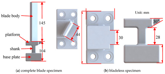 The experimental specimens were crafted in strict accordance with the aforementioned requirements. The blade specimen design is primarily inspired by turbo rotor blade designs, as illustrated in Figure 1. The complete blade specimen consists of the base plate, shank, platform, and blade body, which was excited to measure its vibrational response. The bladeless specimen excluded the blade body component, serving as a surrogate model that mimics the stiffness contributed by the platform while ensuring that it does not resonate when the complete blade is excited. To effectively simulate the first-order bending vibration of the actual blades, an installation angle of approximately 30° was set. During the experiment, the blade was affixed to the test bench with four bolts.