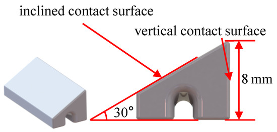 In the operational state of turbo rotor blades, the UPD is firmly pressed against the platform due to centrifugal force. For this experiment, it became essential to apply a force along the radial direction of the blade to accurately simulate the operational state of the damper specimen. The prism damper specimen, as designed in this study and depicted in Figure 2, exhibits stable operation and resistance to self-locking. It boasts two functional surfaces: one being a vertical contact surface, and the other referred to as the inclined contact surface. To simulate centrifugal force, slots have been integrated at the bottom of the damper to enable upward tension via steel wires.
