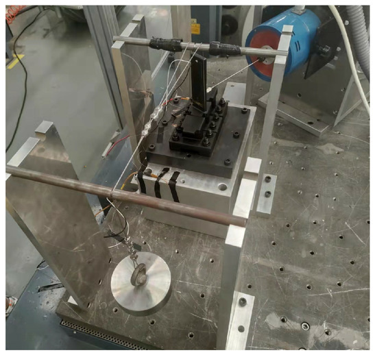 Figure 3 depicts a schematic diagram that shows the relative positioning of the blade and the damper during the experiment, which includes a complete blade specimen, two bladeless specimens, and two dampers. The experimental setup is installed as depicted in Figure 4. One end of a steel wire is threaded through the groove at the bottom of the UPD, securing the damper under the platform, whereas the other end suspended a weight to exert upward tension on the damper, simulating centrifugal loads during operation.