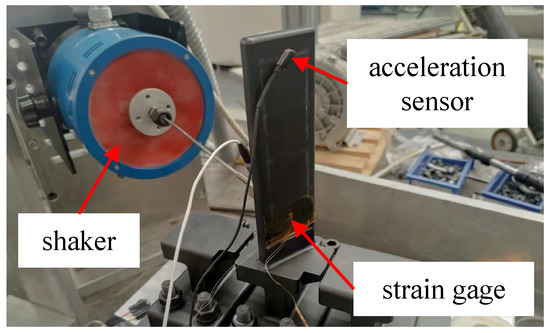 Figure 5 shows the experimental rig for the blade specimen. A shaker was employed to apply force to the blade specimen with controlled amplitude and frequency. To measure the stress of the blade, a strain gage was positioned at its root. Additionally, an acceleration sensor was affixed at the tip of the blade, serving as a means to monitor the acceleration responses.