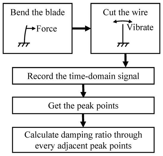 The damping-free vibration method was employed to derive the damping ratio characteristic curve. We attached an easily shearable thin wire to the blade that was approximately 15 mm away from the blade tip. The opposite end of the wire was suspended outside the test bench, suspending a weight. This configuration intentionally introduced an initial deflection in the blade. To minimize any disturbances caused by the weight impacting the ground after its descent, a soft sponge pad was placed beneath it. The strain gage and acceleration sensor were connected to a dynamic signal test and analysis system to record the vibration response of the blade. When the wire was cut, the blade would undergo a damping-free vibration. Through the recorded time-domain signal of the sensor, the damping ratio can be calculated through the method stated in Section 2.2.2. The process of this experiment is summarized in Figure 6.