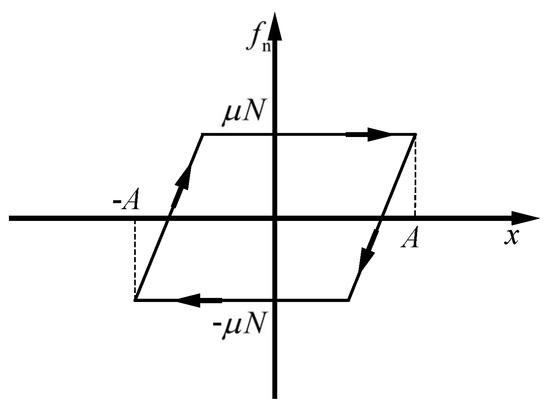 To enhance the analysis of vibrations, transforming the physical model of friction into a mathematical representation is essential. This involves simplifying the characteristics of relative motion between contact surfaces. By conceptualizing the contact surface as a single point exhibiting linear relative motion, a one-dimensional macro-sliding friction model becomes applicable for illustrating the contact behavior. This approach is depicted in Figure 7, showcasing the hysteresis curve of the friction force versus displacement. In this model, once sliding initiates, the magnitude of the friction force stabilizes and remains constant. The mathematical expression for this behavior is presented as follows [31]: