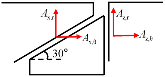 Based on the results of the modal analysis, the parameters required for analyzing the damping characteristics of UPD are provided in Table 2. The directions of the displacement of platforms are defined as Figure 9. We extract the mean radial and tangential modal displacement of each node situated at the two contact surfaces. The point on the blade body where the stress reaches its peak magnitude was selected. Since directly measuring the friction coefficient and tangential contact stiffness of the contact surfaces was challenging, the values provided in the table are estimated based on existing literature pertaining to experimental studies on other UPD vibration reduction devices. During the experimental process, the tangential contact stiffness and friction coefficient of the UPD were adjusted based on the experimental data obtained.