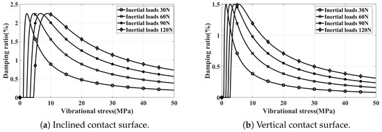 By employing the methods outlined in Section 3.1, we separately predict the damping characteristics under different inertial loads for both inclined and vertical contacted damper installations. The normal pressure on the contact surface, corresponding to various inertial loads, is shown in Table 3. The resulting damping characteristic curves are shown in Figure 10. It is evident that altering the inertial load merely scales the damping characteristic curve along the abscissa, with the peak damping ratio remaining constant.