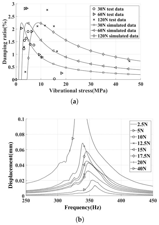The experiment rig for shaker excitation is detailed in Section 2.1. A frequency sweep near the resonance frequency of the blade specimen was conducted to obtain the FRFs. The half-power bandwidth method was employed to calculate the damping ratio and assess the resonance stress at the resonance frequency. Subsequently, the amplitude of the exciting force was adjusted to determine the structural damping ratio and vibration stress under different excitation conditions.
