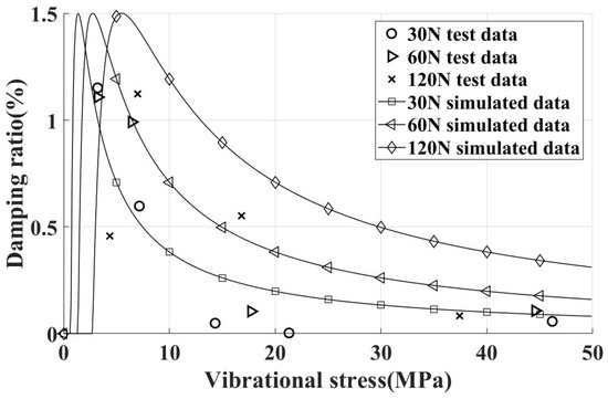 Upon increasing the centrifugal force increased from 30 N to 60 N, an increase in the peak damping ratio was observed. However, upon further increasing the centrifugal force from 60 N to 120 N, no appreciable change in the damping ratio was detected. This phenomenon can be attributed to the fact that, at relatively low levels of normal contact force, changes in normal contact force cause alterations in the tangential contact stiffness. Consequently, this sensitivity leads to the actual tangential contact stiffness being lower than the predicted value when considering a centrifugal load of 30 N. The difference in contact stiffness caused a rightward bias in the damping curve relative to the predicted value. As the centrifugal load increases to a certain level, variations in tangential contact stiffness become less pronounced. With the increase of centrifugal loads, the critical vibration stress increases, while the peak damping ratio remains relatively constant, effectively reflecting this pattern in the simulation results.