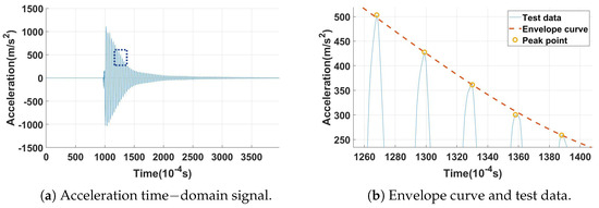 Noting that during the process of calculating the damping ratio from the acceleration or strain time-domain curves, the peak data points may not perfectly align with the exponential decay function (Equation (2)), due to limitations imposed by the sampling frequency of the sensing equipment. To mitigate this potential source of error, the envelope curve of the time-domain response was plotted. A zoomed-in view is shown in Figure 13b. These circled peaks serve as the response points for subsequent damping ratio computations.