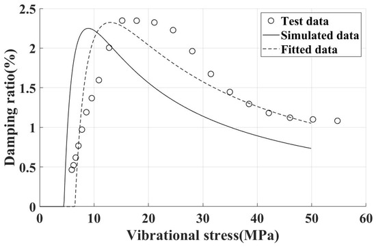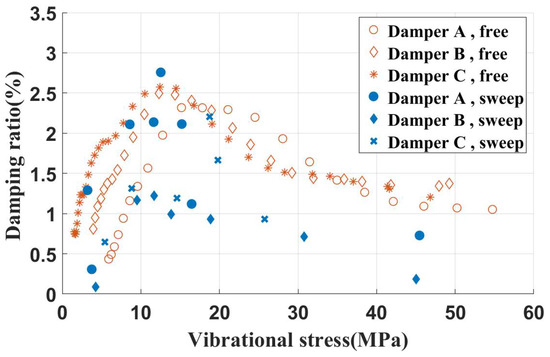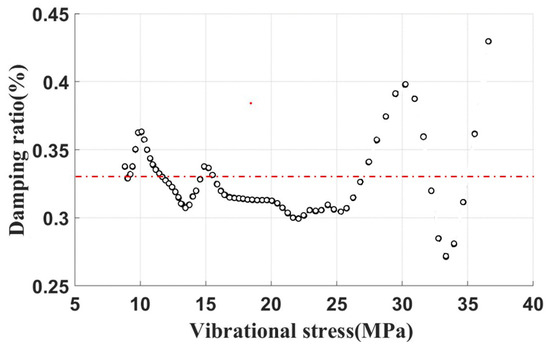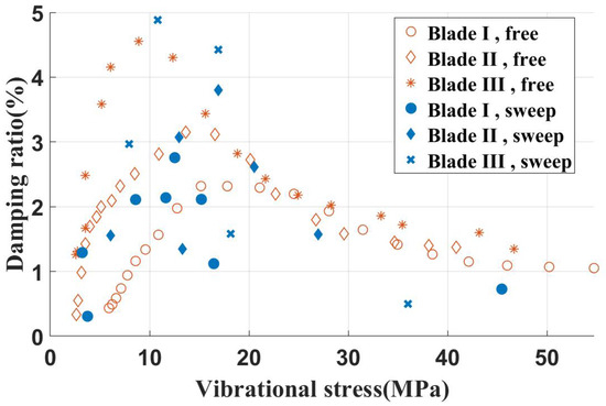 At this juncture, following the acquisition of the time-domain curve of blade vibration, the damping ratio can be determined based on the ratio of adjacent peak points. Simultaneously, through the amplitude of the strain gage measurements, the vibrational stress at the measurement point can be determined. This enabled the establishment of a correlation between the damping ratio and vibrational stress, ultimately resulting in the damping characteristic curve.