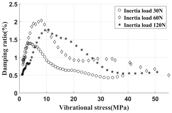The experimental results of the damper, installed on the vertical contact surface under varied inertia loads, are summarized in Figure 17. After installation, the damper provides a peak dry friction damping ratio of approximately 1.5%. With the damper set at a 30° angle, as shown in Figure 2, the normal contact force on the vertical contact surface was equal to that on the inclined contact surface for the same centrifugal load. Overall, installing the UPD significantly enhances damping effects, effectively reducing vibration stress.