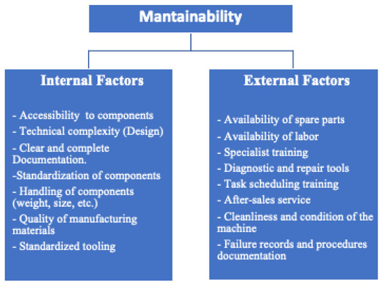 The mean time to repair (MTTR) is a widely used quantitative metric for maintainability, calculated using statistical data on the duration of repairs [8]. The time needed to diagnose and repair can be influenced by multiple elements defined in the initial design stages [9]. These factors can be categorized into two groups: internal or inherent to the system, and external, associated with the maintenance organization. These factors are depicted in Figure 1. For a detailed understanding of these factors, it would be essential to refer directly to the figure and the accompanying explanations in the source document.