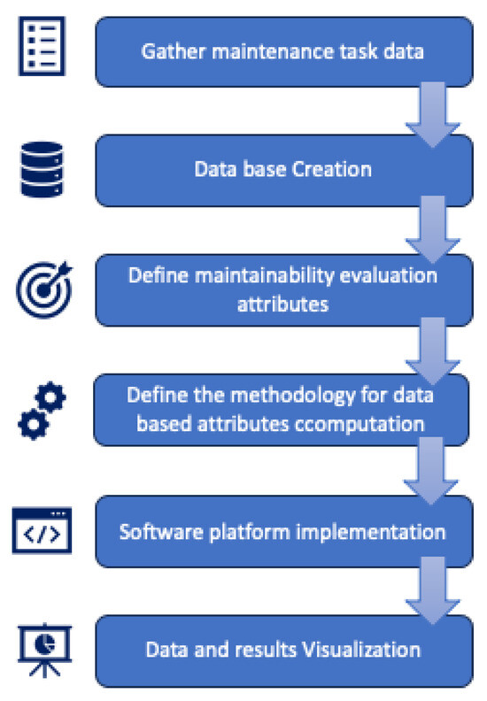 This proposal aims to establish a robust and efficient methodology to complement the use of the evaluation of the maintainability attributes according to the UNE 151001 standard with an MTA-based approach. To this end, a data structure is proposed that enables the capture of information to approximate this analysis using a more quantitative method, with time data for the main identified or planned maintenance tasks. The process begins with gathering the maintenance data from historical records and the technician’s expertise to form a foundation for further maintainability attribute evaluation. The maintainability attributes are identified and defined according to the UNE 151001 guidelines. To streamline the evaluation process, a set of mathematical relations is defined to integrate the analysis and the attribute assessment process. Finally, a visualization system is proposed to facilitate the interpretation and effective communication of the maintainability assessments, supporting informed and prompt decision-making. Figure 2 shows a diagram of the proposed methodology.