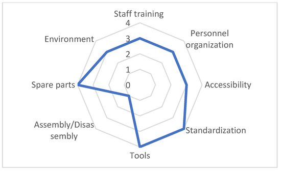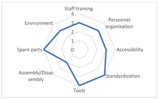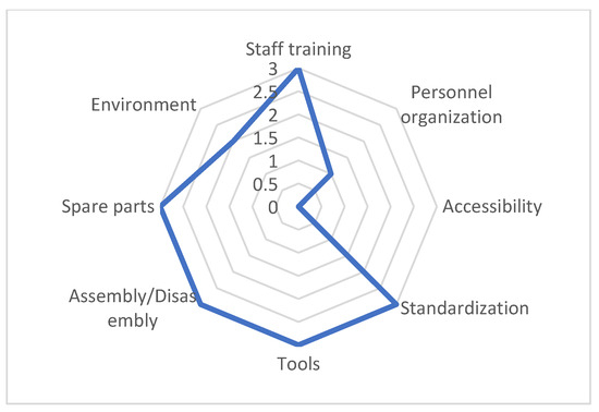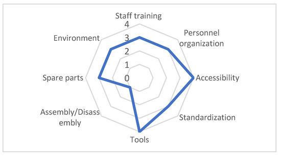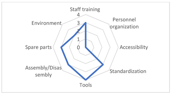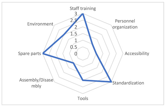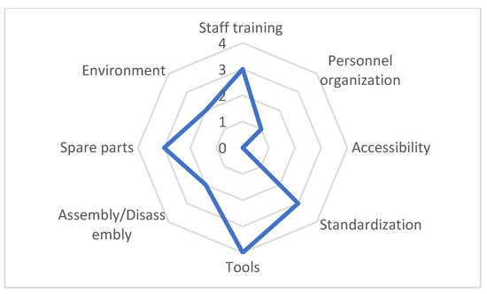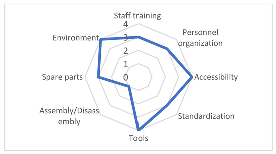 It is important that the limit switches are kept in a good working condition and are regularly inspected as part of the preventive maintenance to ensure the safety of the operations. To carry out this task, the equipment must be de-energized, since an electrical component will be intervened. The accessibility depends on the configuration of the equipment, which is generally attached to one of the end trucks. Once the replacement is complete, its correct operation must be verified, and the relevant adjustments made. From the task analysis, we obtained the following results (Figure 18, Figure 19 and Figure 20). The parameters analyzed include staff training, environment, spare parts, personnel organization, accessibility, assembly/disassembly, standardization, and tools. Figure 18 and Figure 19 show small variations in these parameters. Considering that the safety of the site also plays a crucial role in the maintainability analysis, a safer environment with fewer risks and better compliance with safety regulations can contribute to a higher score. When comparing Figure 18 and Figure 19, this difference is evident. Equipment B, as a higher one, will result in more hazardous conditions for the maintenance interventions under analysis. These variations suggest that there are different maintenance needs and complexity between the two pieces of equipment, which in a way validates the analysis conducted and proposed.