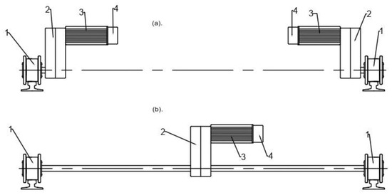 The transmission system for the trolley movement has a different configuration in both cases. Equipment A has an individual transmission system, that is, a motor and gearbox for each wheel on an axle, and Equipment B has a central motor that transmits power to the wheels through a gearbox and axles. Figure 10a illustrates the arrangement of an individual motion transmission system and Figure 10b illustrates a central transmission one.