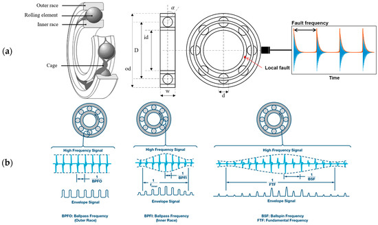 A typical rolling element bearing contains an inner race, outer race (usually fixed), rolling elements, and a cage [14], as shown in Figure 1a [15]. As there is constant contact between the rolling element and the races during operation, the REB can exhibit signs of wear and develop various defects over time, such as spalls, pits, and cracks [16]. Defects can occur in any of the components of the REB. When a defect is developed, it will generate a series of pulses of vibration that repeat periodically at a rate specific to the type of defects [17], as indicated in Figure 1. The frequency at which these defects come into contact with other moving parts can be calculated using the geometry of the bearing and the shaft’s rotational frequency. These theoretical defect frequencies (TDFs), including the ball pass frequency of the inner race (BPFI), ball pass frequency of the outer race (BPFO), ball spin frequency (BSF), and fundamental train frequency (FTF), can be calculated using Equations (1)–(4) below, where is the number of rolling elements, is the shaft frequency, is the rolling element diameter, is the pitch diameter of bearing, and is the contact angle [18]. For special cases where both the inner race and outer race are rotating, is the relative frequency difference between the inner and outer race. It must also be noted that the ball spin frequency (BSF) represents the frequency at which the ball makes contact with only one of the races and therefore the harmonics of this TDF will also need to be observed [19].