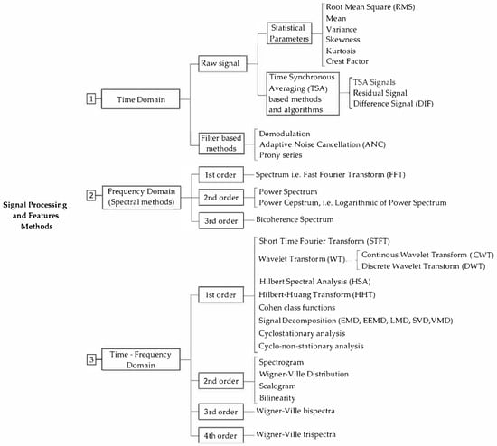 Vibration signals are commonly analysed in the time domain, frequency domain, or time–frequency domain, each presenting their own advantages and drawbacks [12]. When signals recorded are visualised with respect to time, it is said to be in the time domain. Alternatively, the frequency domain allows for the analysis of the same signals with respect to frequency and appears as impulses. The time–frequency domain allows for a representation capturing signal changes over both time and frequency. A taxonomy of the most common signal processing and feature extraction methods is illustrated in Figure 2 [50].