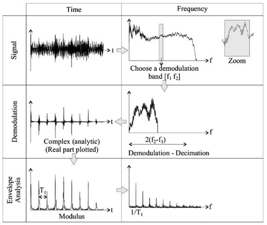 The band selected for demodulation is often from a higher frequency range where structural resonance amplifies the defect-related impulses [19]. The analytic time signal is found, and the modulus is computed. Using the Fourier transform once again, the envelope spectrum is obtained which can be analysed for information pertaining to bearing health. The ideal selection of a demodulation range will allow for certain frequencies to be uncovered. These frequencies may correspond to the shaft frequency, TDFs, and their harmonics as discussed in Section 2. This process is depicted in Figure 3. The correlation of the peaks in the envelope spectrum with a TDF and its harmonics can confirm the presence of a defect in the REB used. The use of HFRT has been considered by many as a common benchmarking method in the identification of bearing health conditions.