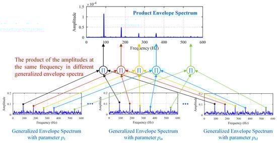 It has been noted that when the measurement signal is contaminated by complex interference noise, the conventional envelope approaches, including both the envelope spectrum and the square envelope spectrum, often fail to effectively reveal the characteristic frequencies of rolling bearing faults [64]. Certain feature enhancement or noise reduction techniques are required for preprocessing, such as signal adaptive decomposition in the time–frequency domain, bandpass filtering, and blind deconvolution. Borghesani and Shahriar [65] proposed a new envelope spectrum, i.e., the log-envelope, to allow for a variance-free hypothesis test for cyclostationary components. Based on the simplified Box–Cox transform, Chen et al. [64] constructed generalised envelopes (GEs) from the analytical signal as a family of signal demodulation tools, and then proposed a spectrum family named generalised envelope spectra (GESs) to reveal cyclostationarity. The Box–Cox transformation establishes a relationship between logarithmic operation and exponentiation operation. Simulation studies showed that the GESs with various transformation parameters (p) exhibit different capabilities and characteristics under different interference noises. An enhanced demodulation spectrum called PES (product envelope spectrum) was developed to combine the performance advantages of different GESs, which can achieve a stronger cyclostationarity detection capability than individual GES. A schematic diagram of the product envelope spectrum is shown in Figure 4 [64].
