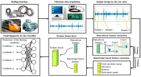 Su et al. introduced the knowledge-based features for fault diagnosis of rolling bearings [94]. They developed a knowledge-informed deep network-based (KIDN) method based on deep CNN to extract and fuse knowledge-based and data-driven features. The knowledge-based features encompass the fault-related statistical features in the time domain (including skewness, kurtosis, and RMS, etc.) and frequency domain characteristics such as the fault spectrum energy obtained by using the Hilbert transform and FFT. A framework of a knowledge-informed deep network is illustrated in Figure 5. It involves two feature extraction modules, i.e., data-driven feature extraction and knowledge-based feature extraction. A feature fusion layer is defined to fuse the data-driven features extracted from the dense layer of the CNN network and the knowledge-based features, and then the new concatenated feature vector will be used as a fused feature map for fault classification. Leveraging the two types of features is believed to be capable of providing rich information for system fault diagnosis and thus resulting in improved robustness and accuracy.