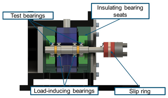 The two outer bearings are the test bearings, because radial and axial forces can load them. The inner bearings are the load-inducing bearings, which can be loaded by radial forces only. The test rig enables bearing loads in radial and axial directions up to 40 kN and revolution speeds up to 8000 rpm. It has a recirculating oil lubrication system for each test chamber, but grease lubricated tests are also possible. The internal sensor system gauges the loads, the revolution speed, the bearing temperature at the outer ring, the oil temperature, and axial and radial vibrations. All tests are observed by the sensor system to detect bearing damages and stop the tests if necessary. The bearing seats are made from an insulating material to avoid undefined current paths.