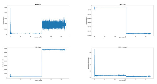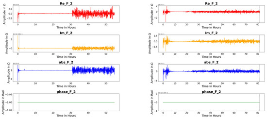 The complex impedance signal is transformed and analyzed in different ways. At first, the voltage signals are filtered using a first-order low pass filter that filters frequencies twice as high as the carrier signal frequency of 20 kHz and a Hampl filter for outlier removal. After calculating the impedance from the measured voltages and known impedance, changes in the signal of the resulting four basis feature real part, imaginary part, absolute value, and phase angle, which are investigated. From each of these base features, features in time and frequency domain are calculated according to Becker-Dombrowsky et al. 2023 [42]. For the frequency domain transformation using a Fast Fourier Transformation, while the measurements with a length of 1.5 s are operated by the NumPy FFT algorithm. From these transformed data, features are calculated without using machine learning or feature engineering algorithms. The features are common for investigating vibration signals [10,12,48]. Due to the fact that these features are state of research in feature engineering for condition monitoring approaches, they are chosen to ensure a comparability to commonly used bearing observation techniques. The content of the features can be found in [10]. Table 2 shows these features.