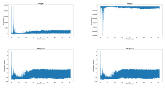 Real part, imaginary part, absolute value, and the phase angle over the operational time in hours for bearing J; bearing type FAG 6205 C C3; C/P = 1.6, n = 5000 rpm, , , β = 0°.