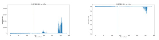 Looking at the raw impedance signal, changes can be seen over the bearings’ operational life. For pure radial loads, the impedance changes in an initial point which indicates an initial damage, as shown in Figure 9 and Figure 10. The phase angle is of about −90°, which means that the bearings are run in EHL regime.